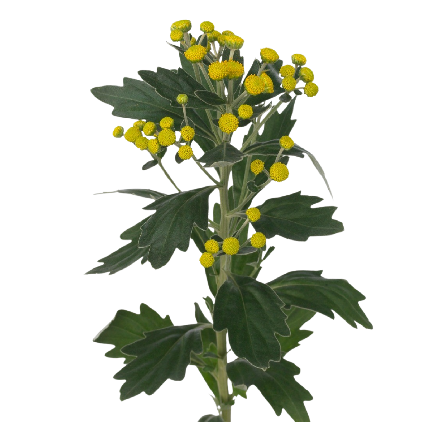 Die Ajania hat grau-grüne Blätter und gelbe Blüten.