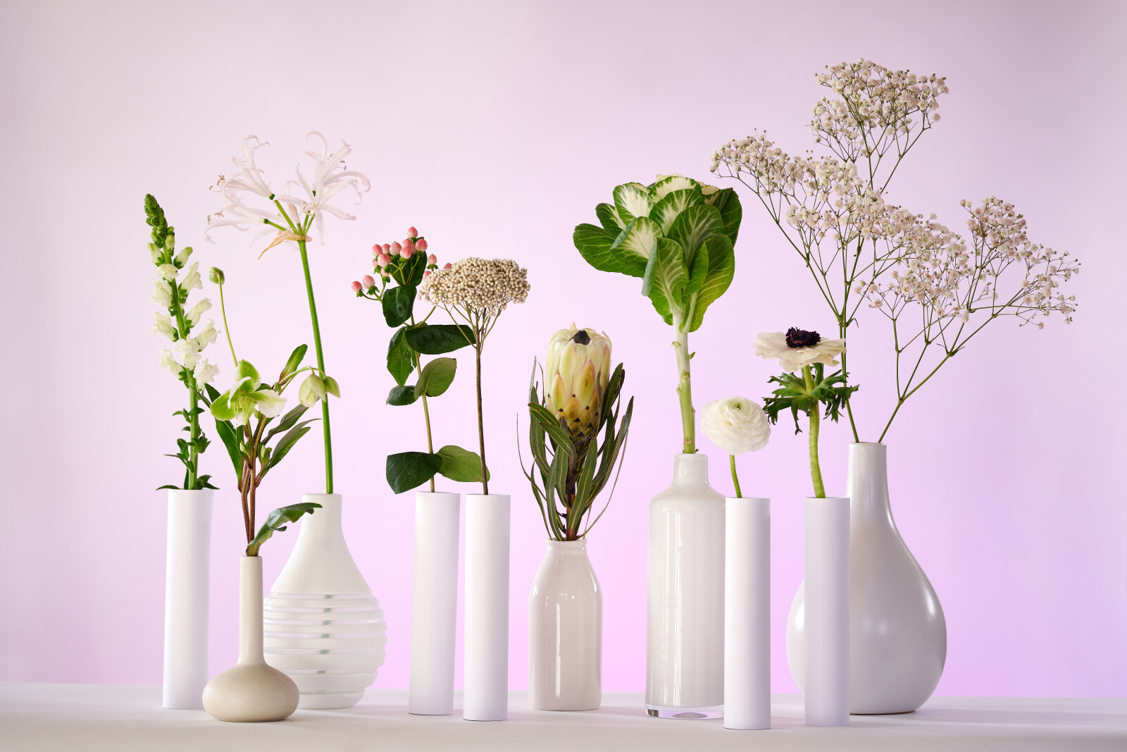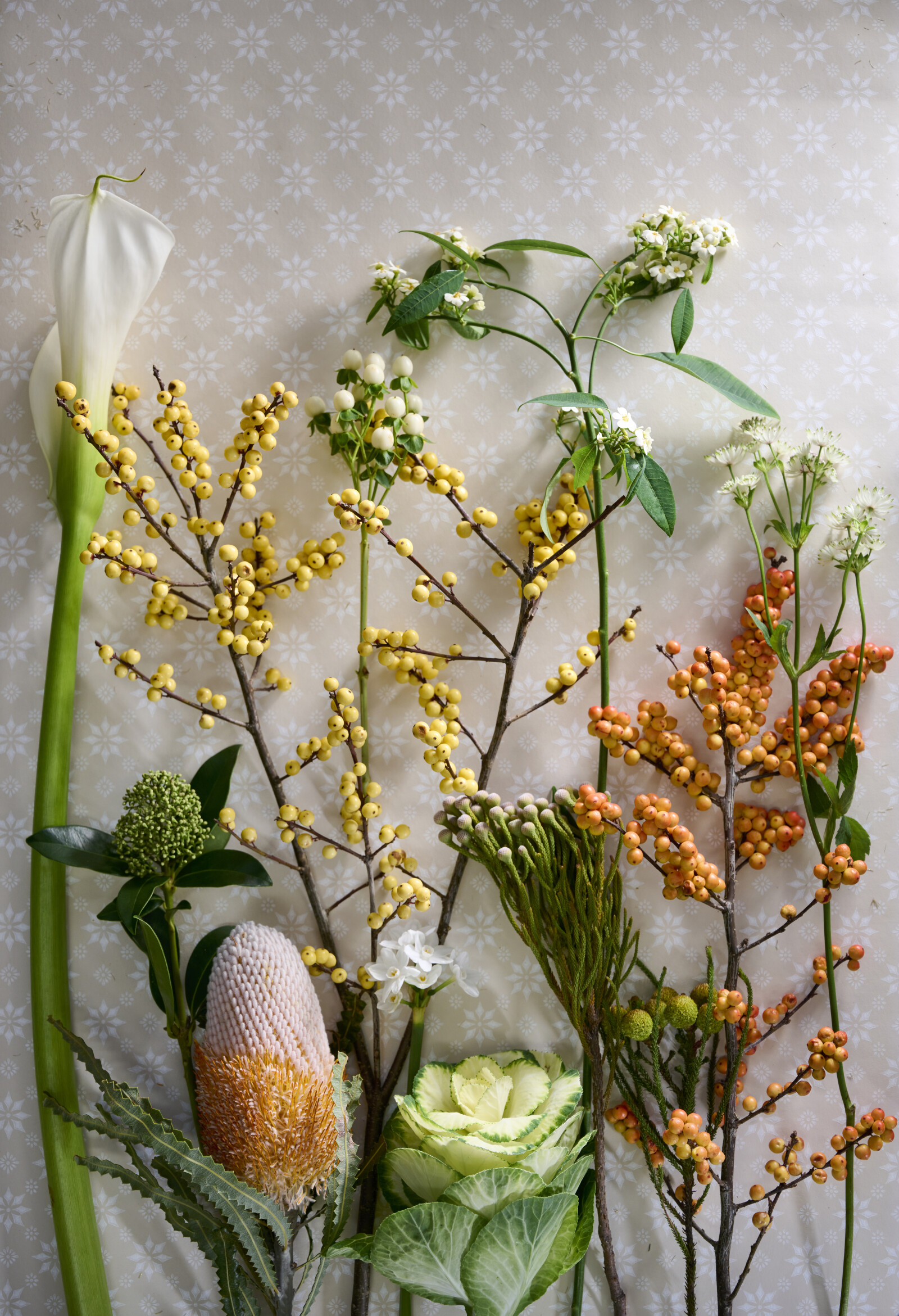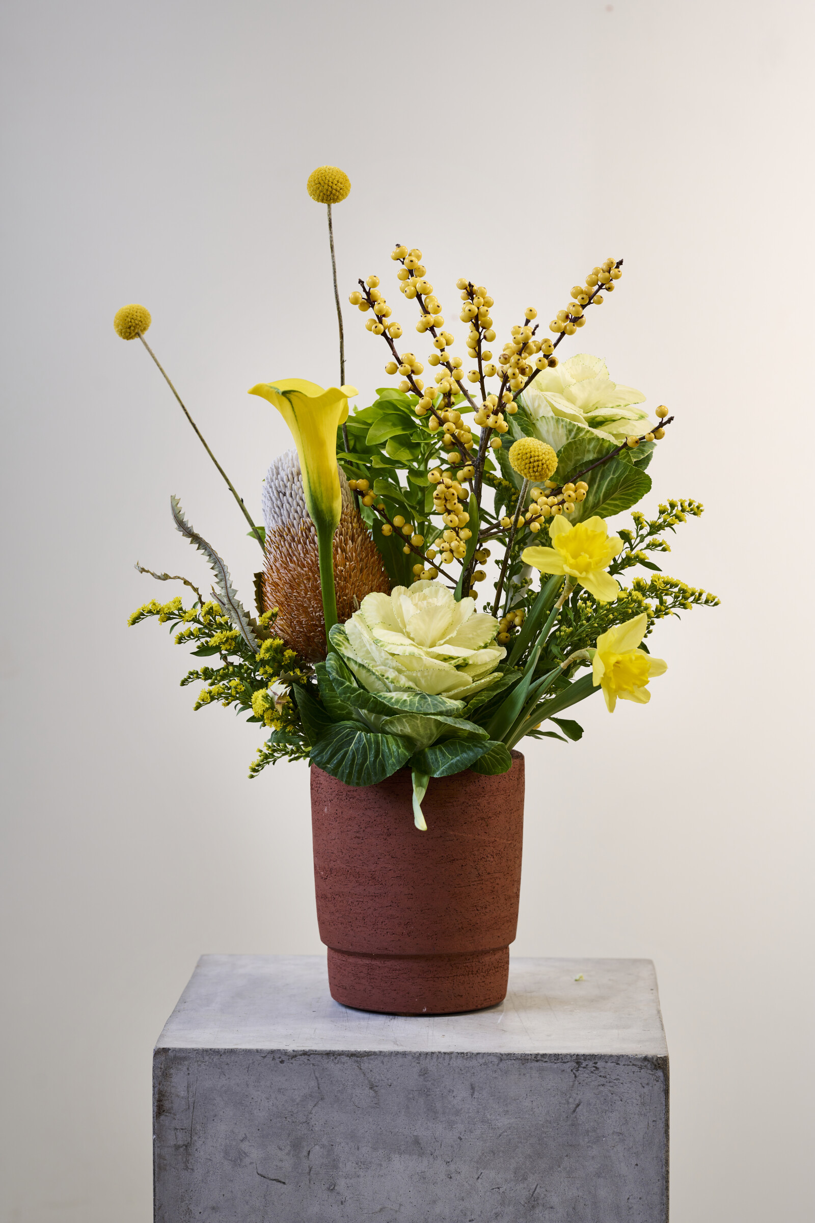 Brassica lässt sich gut mit anderen Blumen und Grünpflanzen kombinieren, z. B. mit Eukalyptus. Das eröffnet unzählige Möglichkeiten für Kreativität.