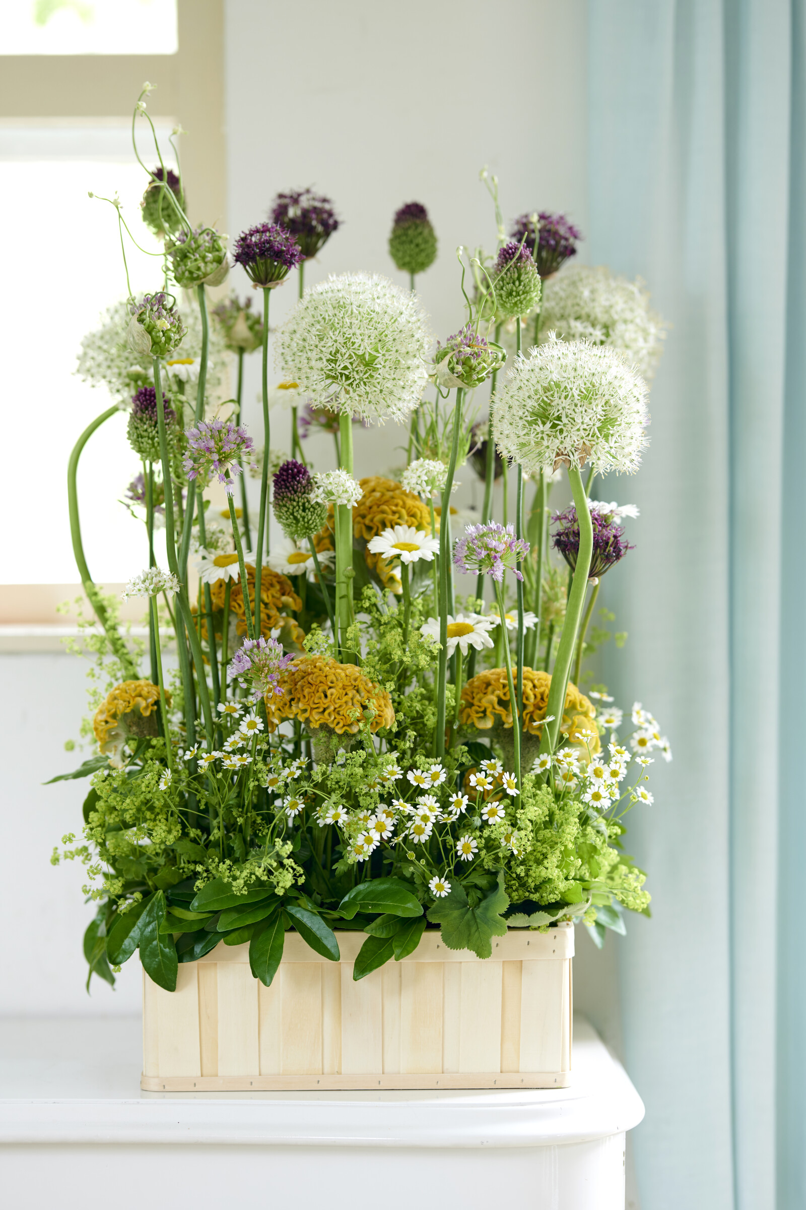 Mit ihren strahlend weißen Blütenblättern und den gelben Blütenköpfen verleiht die Leucanthemum den Blumenarrangements ein frisches und zeitloses Element.