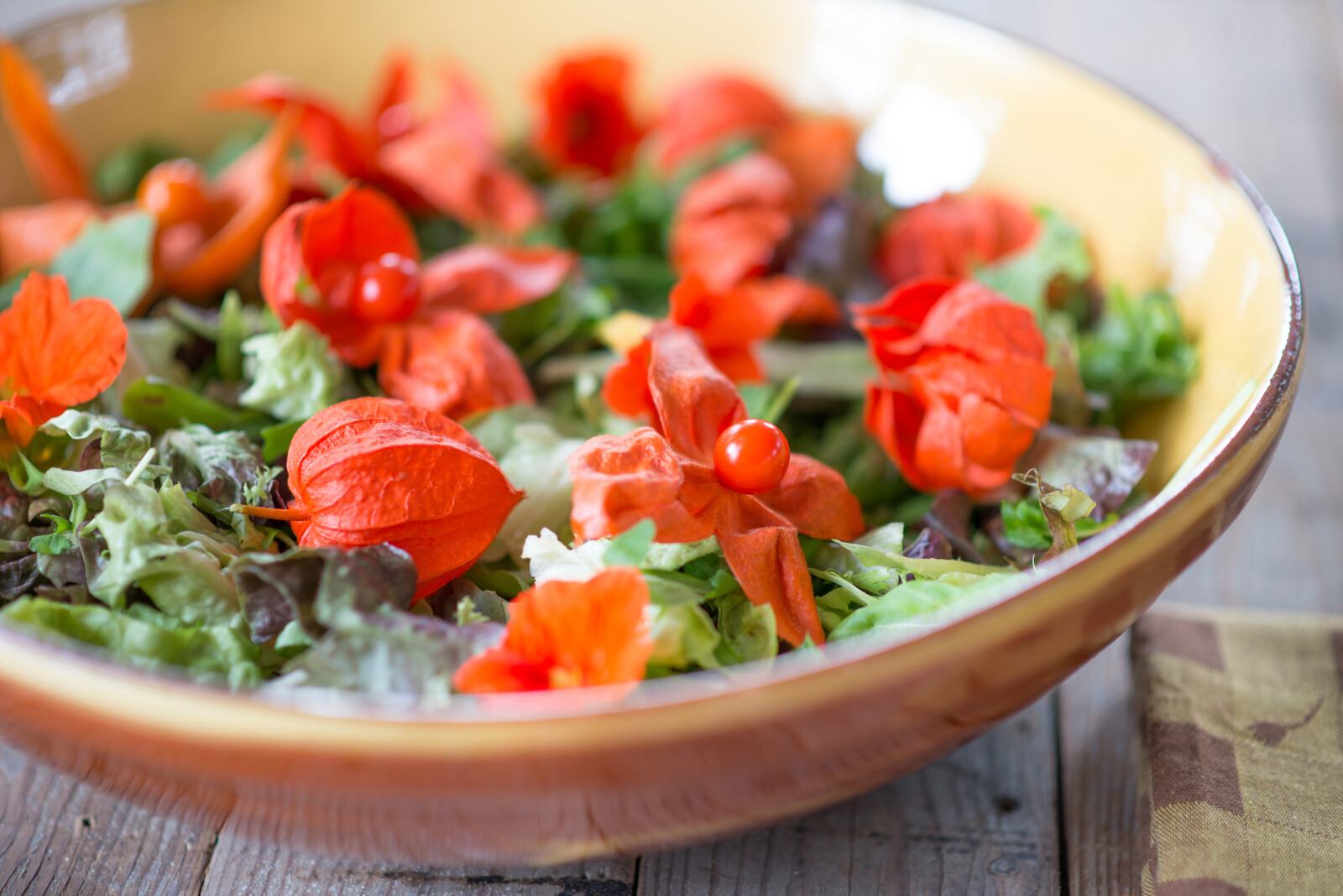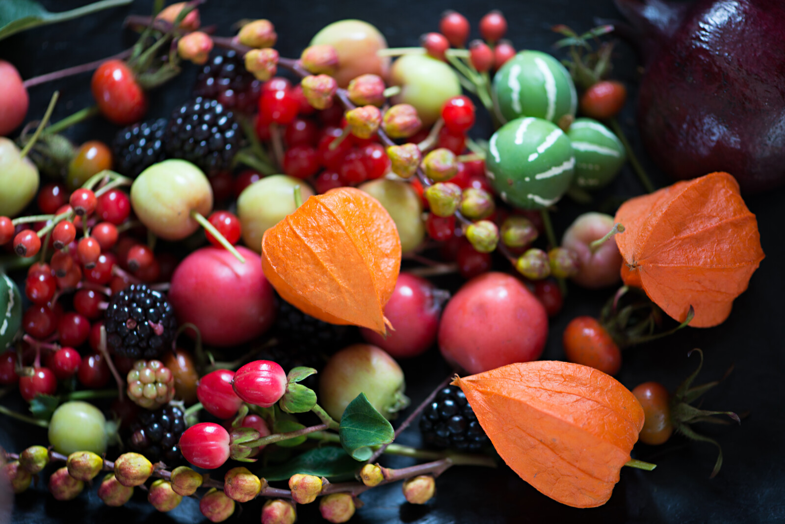 Physalis gibt es in verschiedenen Farben, wie Orange, Gelb und Violett.