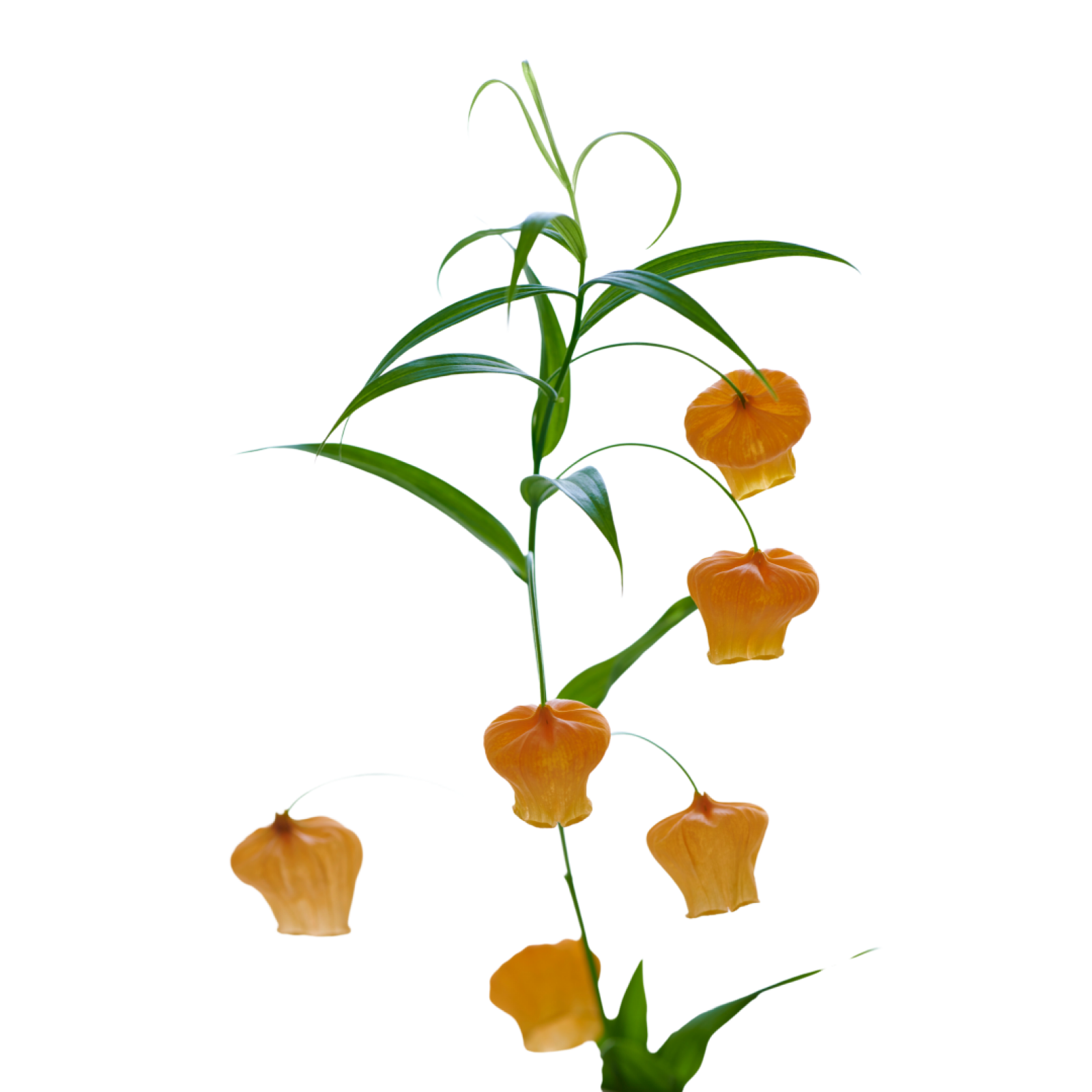Die Farbe der Sandersonia reicht von einem tiefen Orange bis zu einem helleren, fast pfirsichfarbenen Farbton.