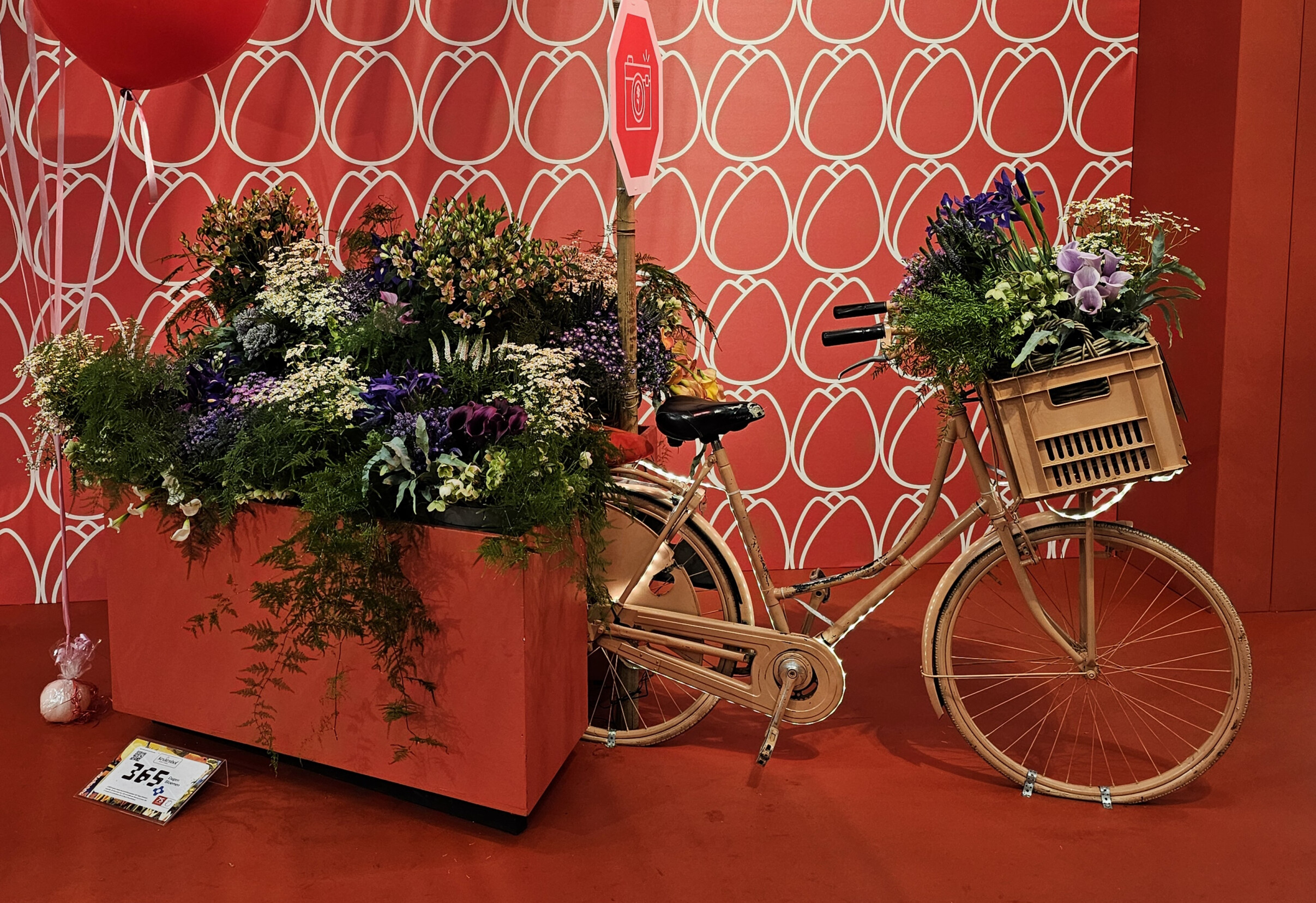 Im Oranje-Nassau-Pavillon auf dem Keukenhof sind bis Mittwoch folgende Blumen zu bewundern: verschiedene Sorten von Hypericum, Veronica, Iris, Matricaria (Kamille), Helleborus Magnificant Bells, Calla, Limonium und blaues und rosa Limonium. All dies wird ergänzt durch dekorative Grünpflanzen wie Monstera-Blätter, Philodendron Xanadu, Cyrtomium falcatum und verschiedene Spargelarten.